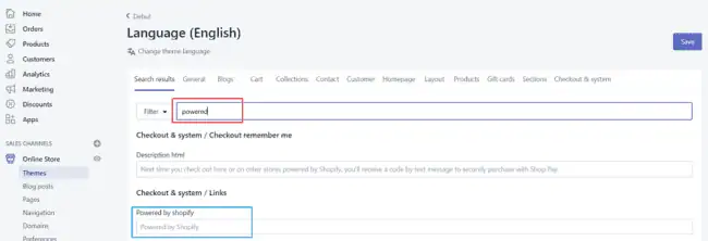 Type ‘Powered’ in the Filter box. Click inside the ‘Powered by Shopify’ box and press your spacebar once to remove the placeholder text.
