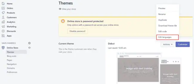 It will show your active theme on the right side. Click the ‘Actions’ drop-down box that appears next to it. A menu will pop up. Choose ‘Edit languages’ from the list.